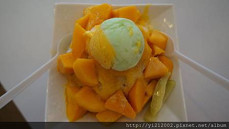 我們點了TOP1的冰,好大一碗好多芒果還有一坨冰淇淋,但只要100元的這一盤,好超值歐~旁邊還有醃製的芒果青鹹鹹酸酸好滋味,這雙色冰淇淋是情人果混合芒果的,兩種享受~不過中間冰的部分是淋了糖水的刨冰,跟芒果的味道有點分離,下次會想試試TOP2的冰,好像是芒果雪花冰那種。