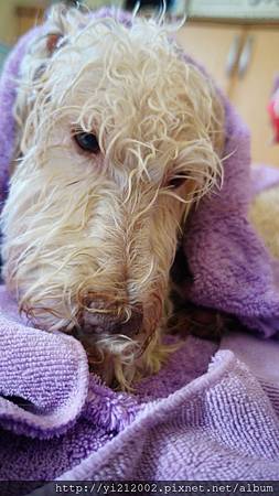 洗完澡先在外面的地上鋪上吸水毛巾,拉拉就乖乖躺在上面,整理自己的毛髮,然後乖乖迎接吹風機將毛吹乾,這真是很大的突破了。