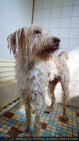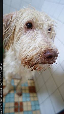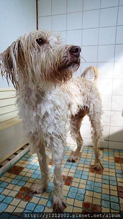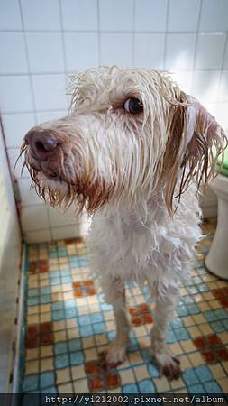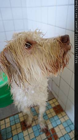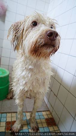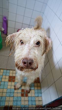 哈!真不知道狗狗為什麼都不太喜歡洗澡呢?進來最常有的表情還是眼巴巴望著門上的喇叭鎖,期待洗好可以打開,離開這個空間。