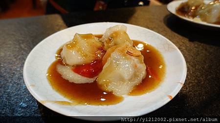 蝦仁肉圓,一顆有一個蝦仁,用清蒸的,肉圓皮吃起來軟軟的,外觀就留下製作時手壓的形狀,裡面的餡就像肉丸子,集合成一團,口味很清淡,淋醬最外層淺咖啡色的有很香的柴魚味,靠近肉圓白色的是蒜末,中間還有些甜辣醬,三顆一組五十五元。