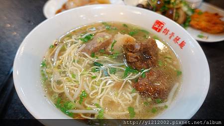 最後這排骨酥麵我搭配意麵吃,排骨酥是滷過炸過又蒸過,肉裡有鹹香味,調味微鹹,排骨帶骨的比例滿高的,跟廟東小吃幾乎不帶骨的完全不同,湯頭是有油蔥的客家味,一碗裡給的豆芽菜很多,上頭還有非常綿密鬆軟的芋頭,吃完不會特別讓人一直回味,但也是好吃的小吃。