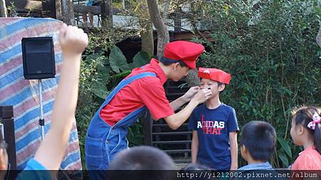 可能是貼的過程台下的其他小朋友覺得有趣,不停地哈哈大笑,弟弟不曉得是害羞還是怎麼了,怎樣都不肯貼上鬍子,貼一次他就馬上撕掉一次,讓馬力歐的戲演不下去,只好送她小金幣結束。