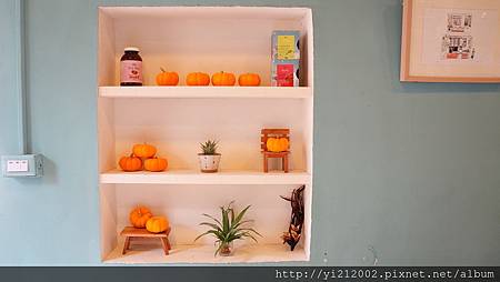門口旁這小小的開放櫃子,小小的南瓜各佔據一方。