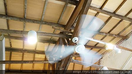 抬頭往上看,老房子原有的屋頂架構毫不掩飾地讓大家欣賞,白色的小掛扇旋轉著。