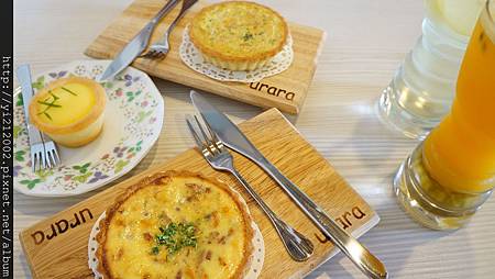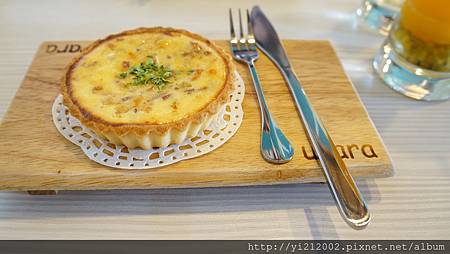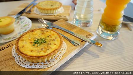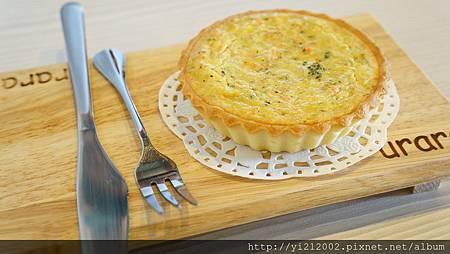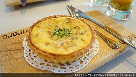 TJ點的是蔬菜鹹派(加黃檸檬汁190元)。派下墊著白色的紙花墊,很襯,下方的小木盤很別出心裁。