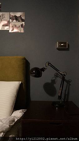 房間裡的燈飾也選了很多種,以金屬工業風的為主。床旁懸臂檯燈。